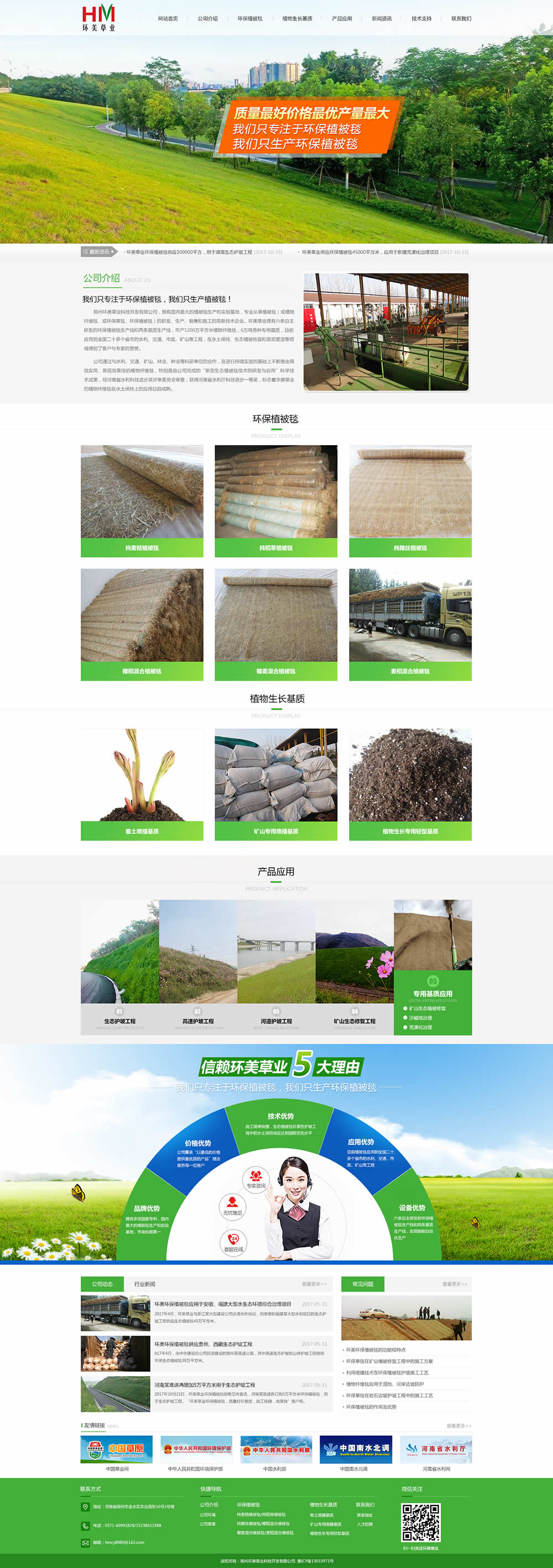 鄭州環(huán)美草業(yè)科技開發(fā)有限公司,擁有國(guó)內(nèi)大的環(huán)保植被毯研發(fā)和生產(chǎn)基地,擁有國(guó)內(nèi)的客土噴播專用基質(zhì)生產(chǎn)線,是專業(yè)從事環(huán)保植被毯(又稱植物纖維毯、環(huán)保草毯、環(huán)保植被毯、生態(tài)毯)和客土噴播專用基質(zhì)研發(fā)、生產(chǎn)和銷售的科技型企業(yè)。環(huán)美草業(yè)一直致力于產(chǎn)品與技術(shù)的創(chuàng)新,擁有多項(xiàng)專利生產(chǎn)設(shè)備和專利產(chǎn)品,包括六條自主研發(fā)的環(huán)保植被毯生產(chǎn)線和兩條基質(zhì)生產(chǎn)線,年產(chǎn)環(huán)保植被毯1200萬平方米,年產(chǎn)客土噴播專用基質(zhì)8萬立方米。目前產(chǎn)品應(yīng)用到全國(guó)二十多個(gè)省市的水利、交通、市政、礦山等工程。...